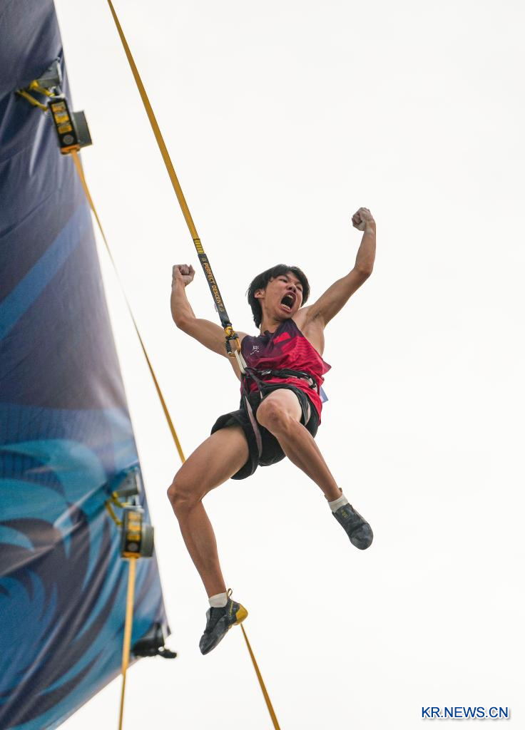 14일 쓰촨(四川)성 청두(成都)시에서 열린 '제12회 월드게임' 스포츠클라이밍 남자 스피드 개인전에서 중국 선수 추서우훙(儲守宏)이 금메달을 확정한 뒤 우승을 기뻐하고 있다.