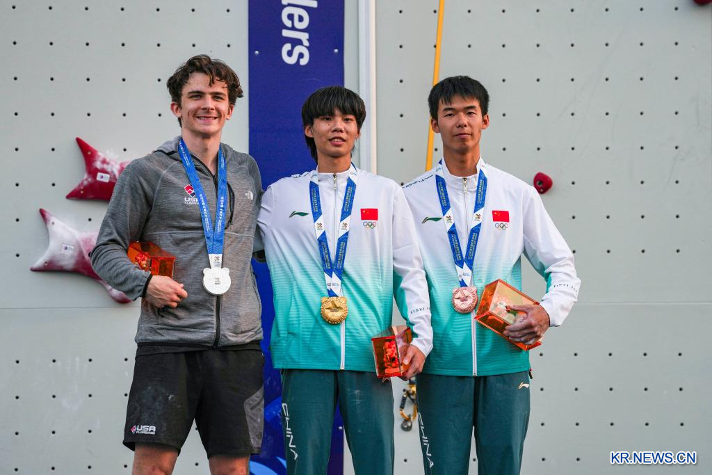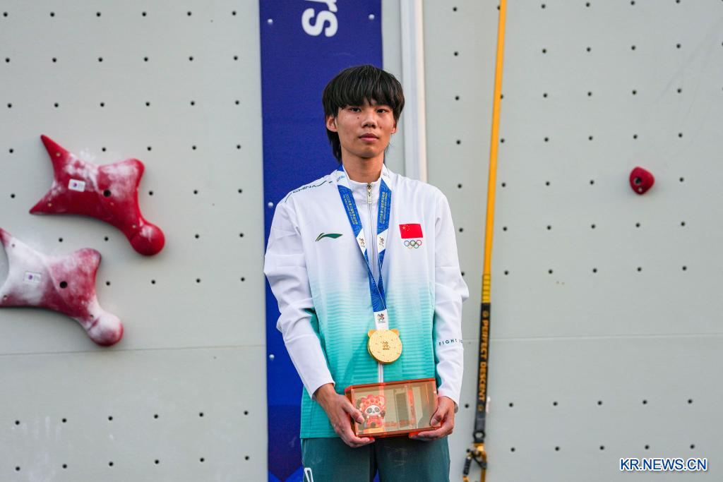 14일 쓰촨(四川)성 청두(成都)시에서 열린 '제12회 월드게임' 스포츠클라이밍 남자 스피드 개인전에서 중국 선수 추서우훙(儲守宏)이 금메달을 획득한 뒤 시상대에 올랐다.
