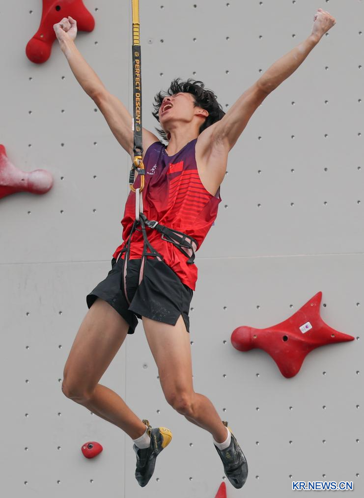 14일 쓰촨(四川)성 청두(成都)시에서 열린 '제12회 월드게임' 스포츠클라이밍 남자 스피드 개인전에서 중국 선수 추서우훙(儲守宏)이 금메달을 확정한 뒤 우승을 기뻐하고 있다. \