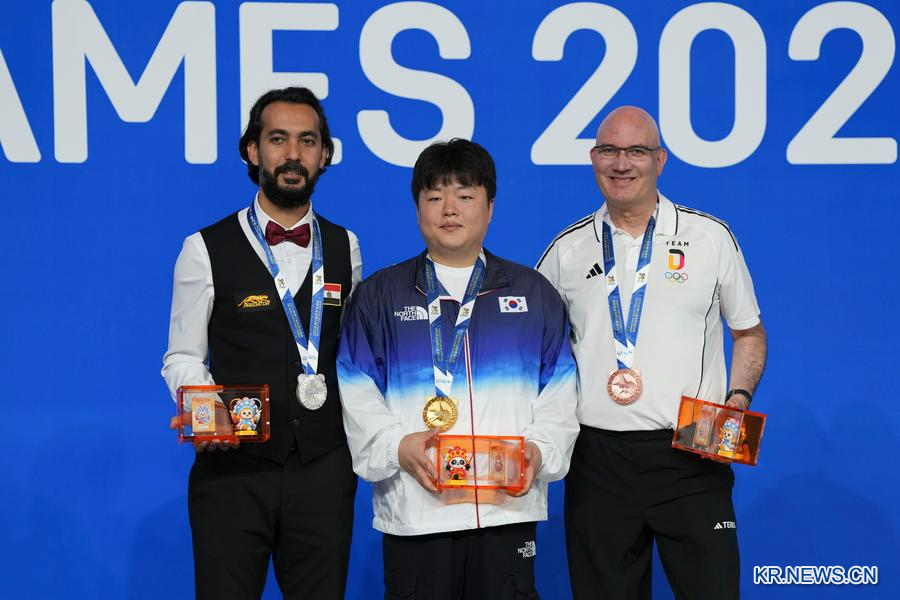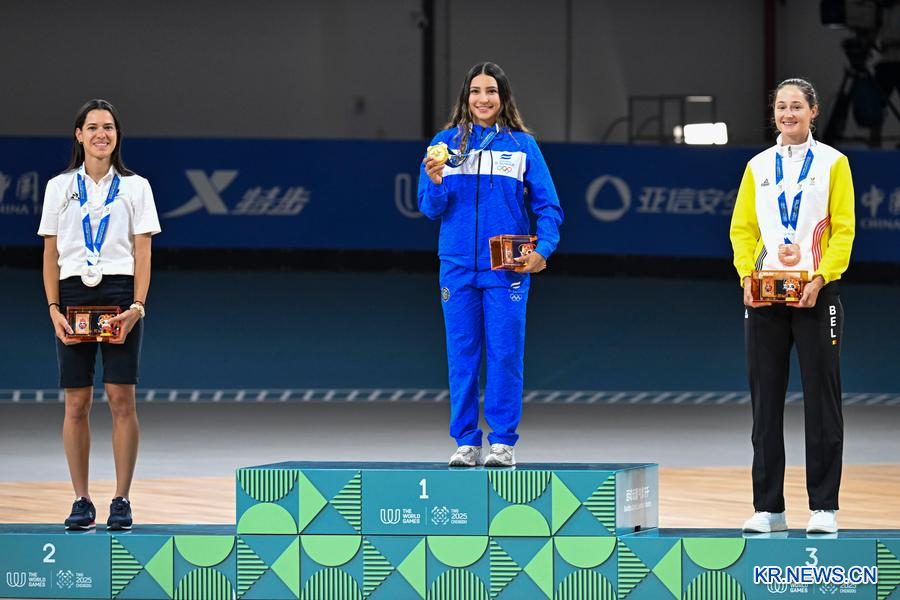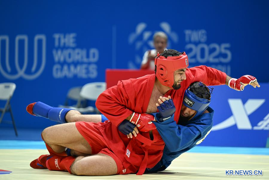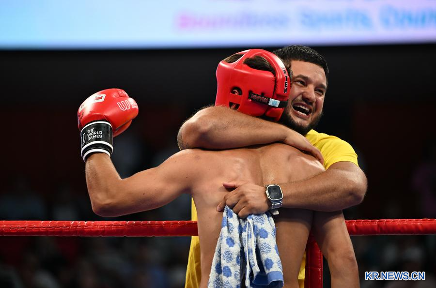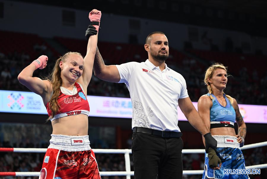 14일 '제12회 월드게임' 삼보 남자 격투 98㎏급 금메달 결정전에서 아르메니아 선수 아르만 아바네시안(위)이 금메달을 차지했다. (사진/신화통신)14일 스포츠클라이밍 남자 스피드 개인전에서 중국 선수 추서우훙(儲守宏)이 금메달을 확정한 뒤 우승을 기뻐하고 있다. (사진/신화통신)14일 당구 종목 시상식에서 3쿠션 남자부 우승을 차지한 한국의 조명우(가운데), 준우승을 차지한 이집트 선수 사메 시둠(왼쪽), 동메달을 차지한 독일 선수 마르틴 혼이 함께 기념촬영을 하고 있다. (사진/신화통신)14일 킥복싱 남자 K1 63.5㎏급 결승에서 우크라이나 선수 글립 마주르(왼쪽)가 아제르바이잔의 아민 굴리예프를 꺾고 우승한 뒤 코치와 함께 기뻐하고 있다. (사진/신화통신)14일 스피드 롤러 스케이팅 여자 트랙 200m 추격전 시상식에서 우승을 차지한 엘살바도르의 이본네 사라이 노체스 가야르도(가운데), 준우승을 거둔 프랑스의 하이라 브뤼네 알바레스(왼쪽), 3위를 차지한 벨기에의 프랑 바누트가 함께 기념촬영을 하고 있다. (사진/신화통신)14일 심판이 이스라엘 선수 율리아 사치코프(왼쪽)의 승리를 선언하고 있다. 이날 자유격투 여자 K1 52kg급 결승에서 사치코프가 금메달을 차지했다. (사진/신화통신)14일 파워리프팅 남자 클래식 중량급 결승에서 노르웨이 선수 셸 에길이 경기를 치르고 있다. 그는 이날 경기에서 동메달을 차지했다. (사진/신화통신)