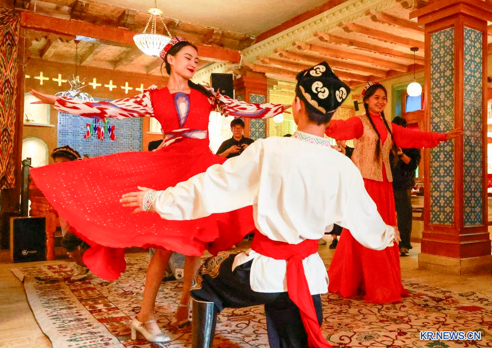 14일 신장(新疆)위구르자치구 허톈(和田) 퇀청(團城)의 한 특색 상점에서 배우가 관광객들을 위해 춤을 선보이고 있다.