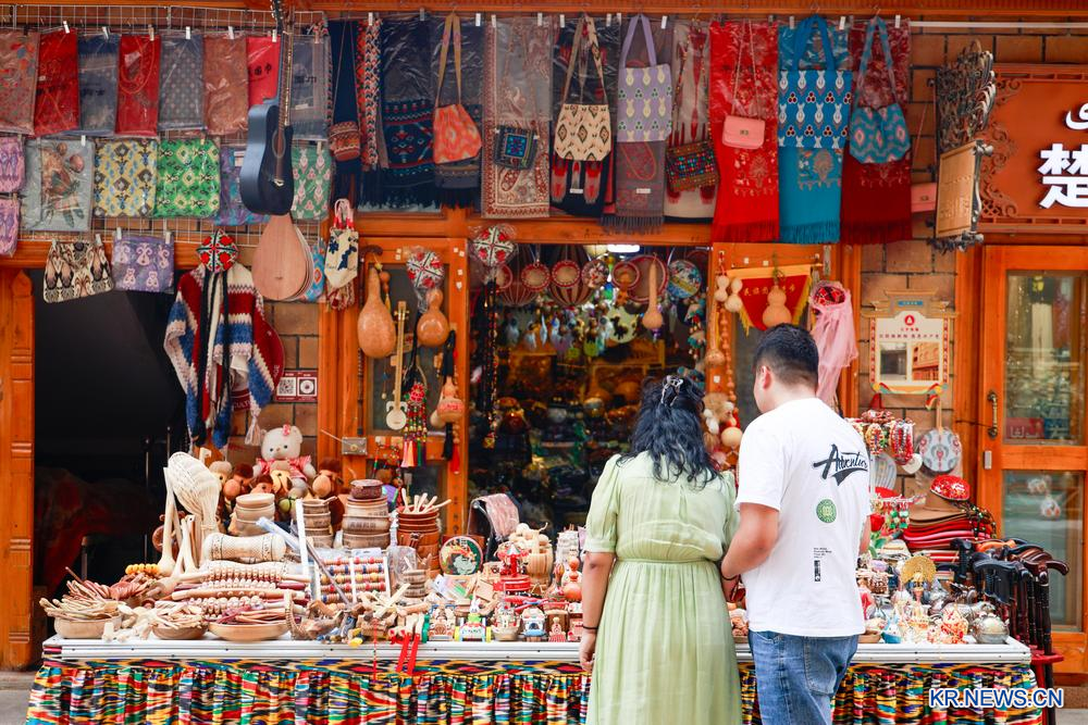 14일 신장(新疆) 허톈 퇀청에서 관광객들이 수공예품을 구경하고 있다. 2025.8.15