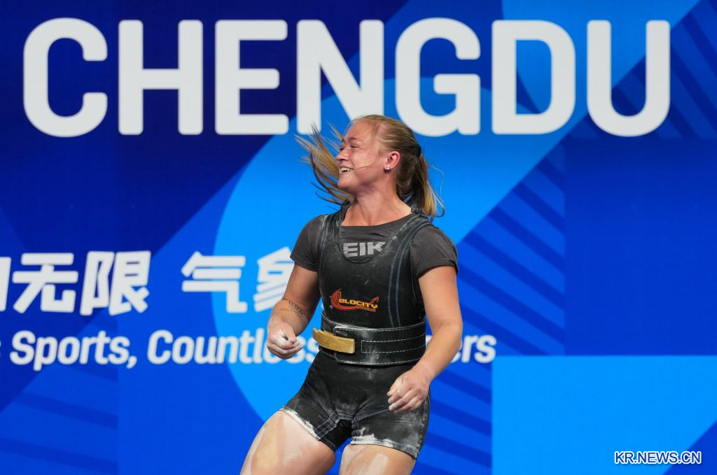 [신화망 청두 8월17일] 16일 쓰촨(四川)성 청두(成都)시에서 열린 '제12회 월드게임' 파워리프팅 여자 중량급 결승전에서 우승을 차지한 미국의 테일러 린 라샤펠. 이날 경기에서 우크라이나의 라리사 솔로비오바가와 이탈리아의 알레산드라 체르닐리아로가 각각 은메달과 동메달을 획득했다.