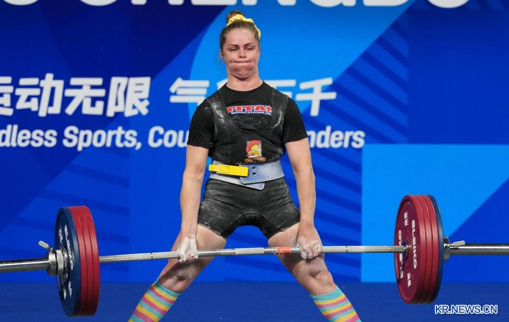 16일 쓰촨(四川)성 청두(成都)시에서 열린 '제12회 월드게임' 파워리프팅 여자 중량급 결승전에서 우승을 차지한 미국의 테일러 린 라샤펠. 이날 경기에서 우크라이나의 라리사 솔로비오바가와 이탈리아의 알레산드라 체르닐리아로가 각각 은메달과 동메달을 획득했다.