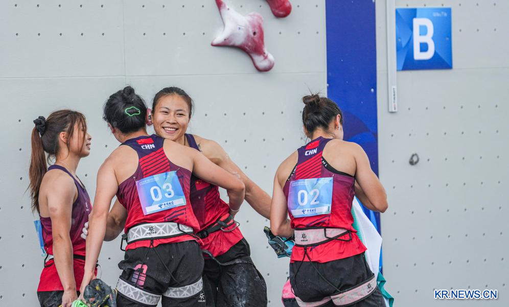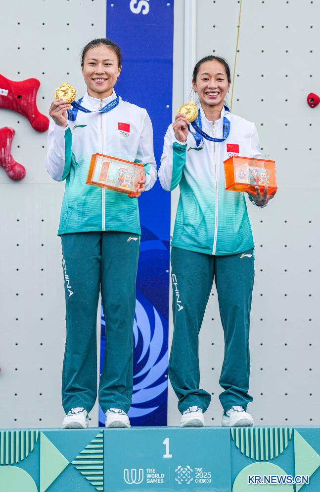 16일 쓰촨(四川)성 청두(成都)시에서 열린 '제12회 월드게임' 스포츠클라이밍 여자 스피드 릴레이 결승에서 중국의 덩리쥐안(鄧麗娟)/저우야페이(周婭菲) 조가 우승을 차지했다. 중국의 친위메이(覃於妹)/장사오친(張少琴) 조가 은메달을, 한국 정지민/성한아름 조가 동메달을 획득했다.