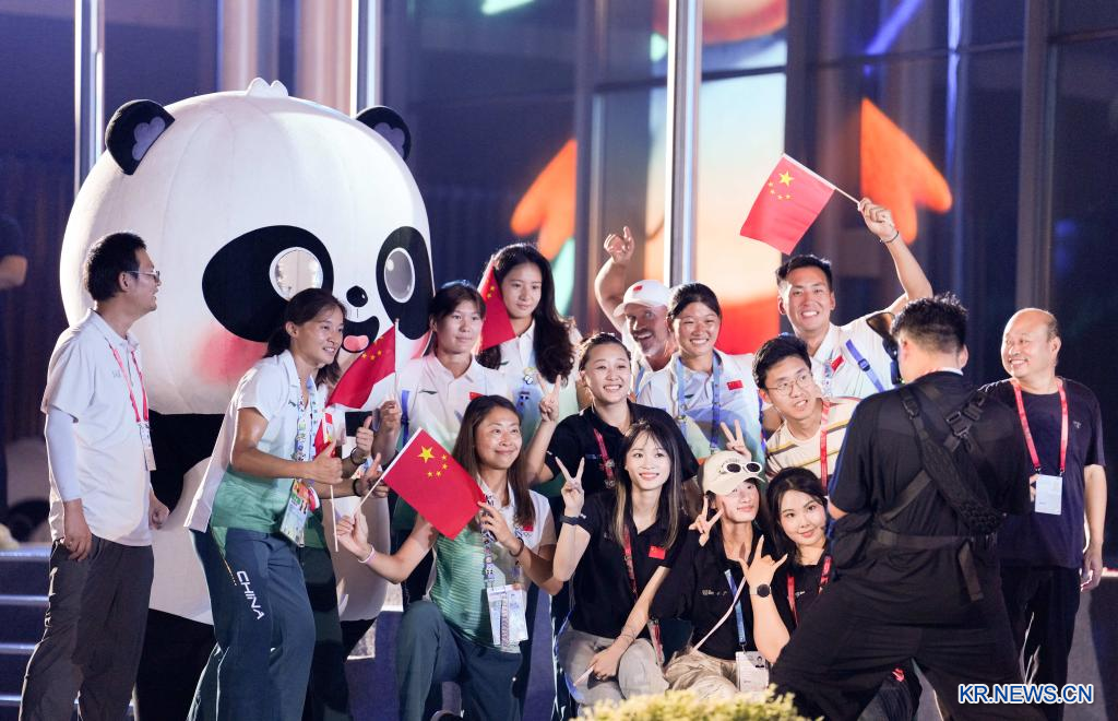 17일 열린 폐막식에서 선수들이 제12회 월드게임 마스코트 ‘수바오(蜀寶)’와 기념사진을 찍고 있다.