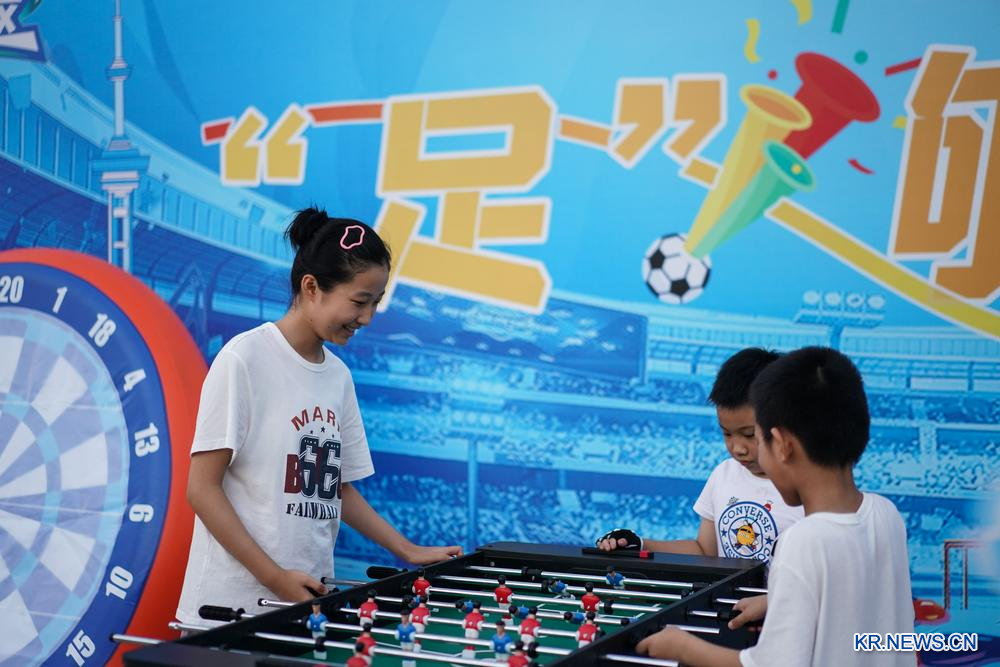 17일 축구 경기 관람 전 테이블 축구 게임을 즐기는 시민들.