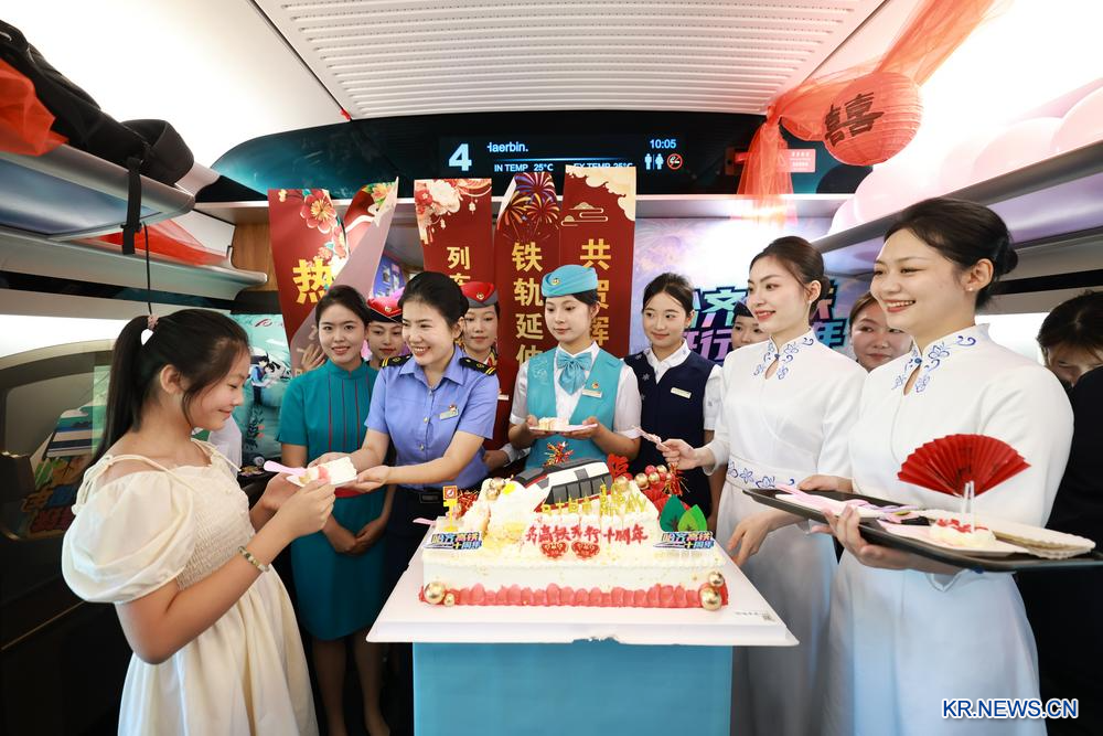 치치하얼(齊齊哈爾)구간 열차 승무원이 17일 관광객에게 하치(哈齊·하얼빈~치치하얼) 고속철도 개통 10주년 기념 케이크를 나눠주고 있다.