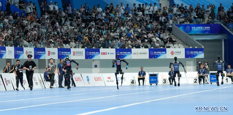 [신화망 베이징 8월19일] '2025 세계 휴머노이드 로봇 운동회' 100m 결승전이 17일 베이징 국가스피드스케이팅 경기장에서 열렸다. 해당 종목에선 베이징 휴머노이드로봇혁신센터가 내놓은 '쥐선톈궁(具身天工) 울트라'가 21.50초의 기록으로 우승을 차지했다.