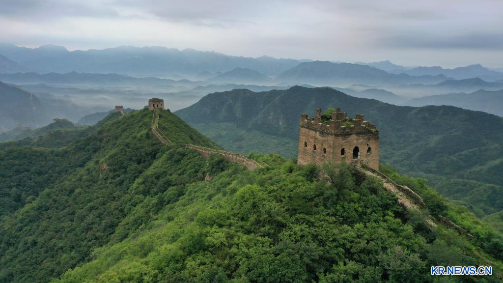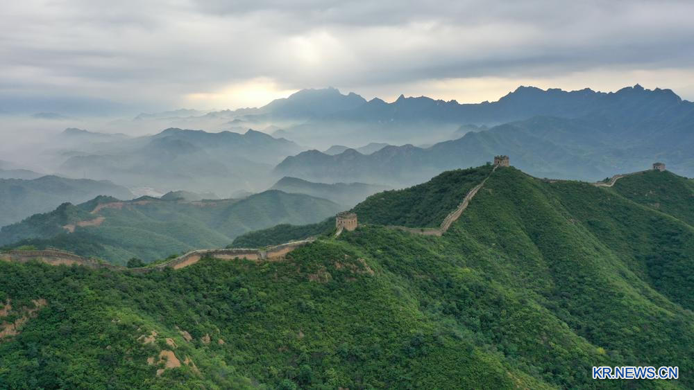 [신화망 베이징 8월19일] 18일 베이징시 미윈(密雲)구 구베이커우(古北口)진에서 쓰마타이(司馬臺) 만리장성을 드론 사진에 담았다. 2025.8.18