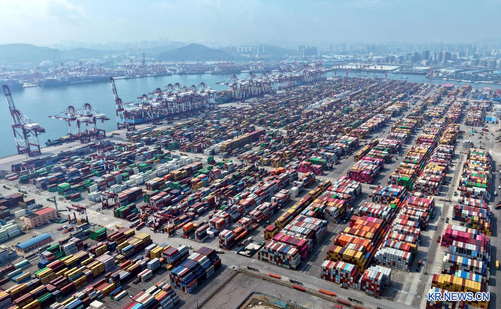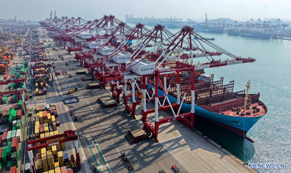 19일 산둥(山東) 칭다오(青島)항 첸완(前灣) 항구구역에서 컨테이너를 하역 중인 화물선.