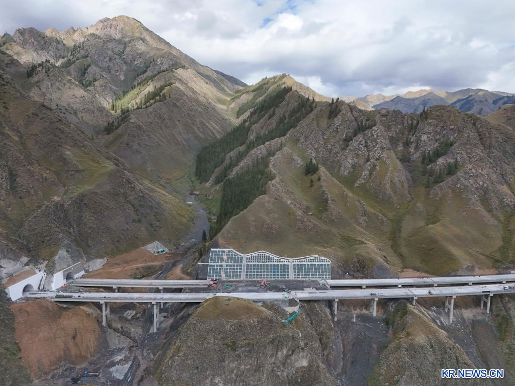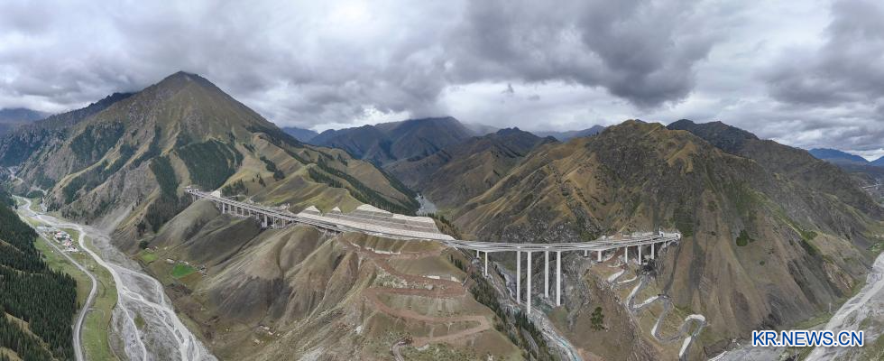 톈산 산맥을 가로지르는 신장위구르자치구 우루무치~위리 고속도로.2025.8.19 (드론 사진)