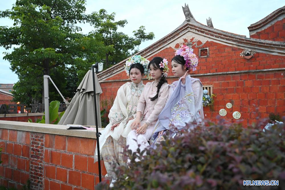 19일 관광객들이 푸젠(福建)성 진장(晋江)시 우린(梧林)촌의 붉은벽돌 고택 앞에서 기념사진을 찍고 있다.