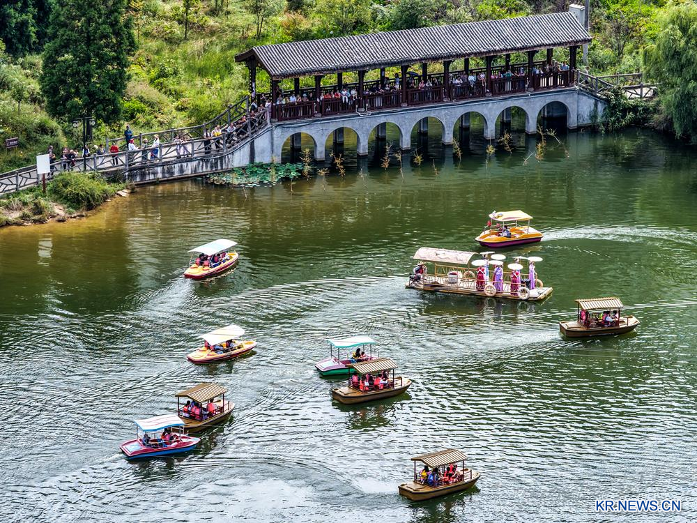 충칭(重慶)시 스주(石柱)투자(土家)족자치현 황수이(黃水)진 웨량후(月亮湖) 관광지에서 배를 타는 관광객을 21일 드론 사진에 담았다.