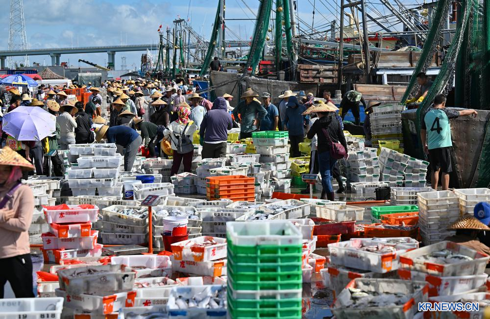 21일 하이난성 원창(文昌)시 칭란(清瀾)항구에서 어민과 상인이 어획물을 내리고 거래에 한창이다. 2025.8.21