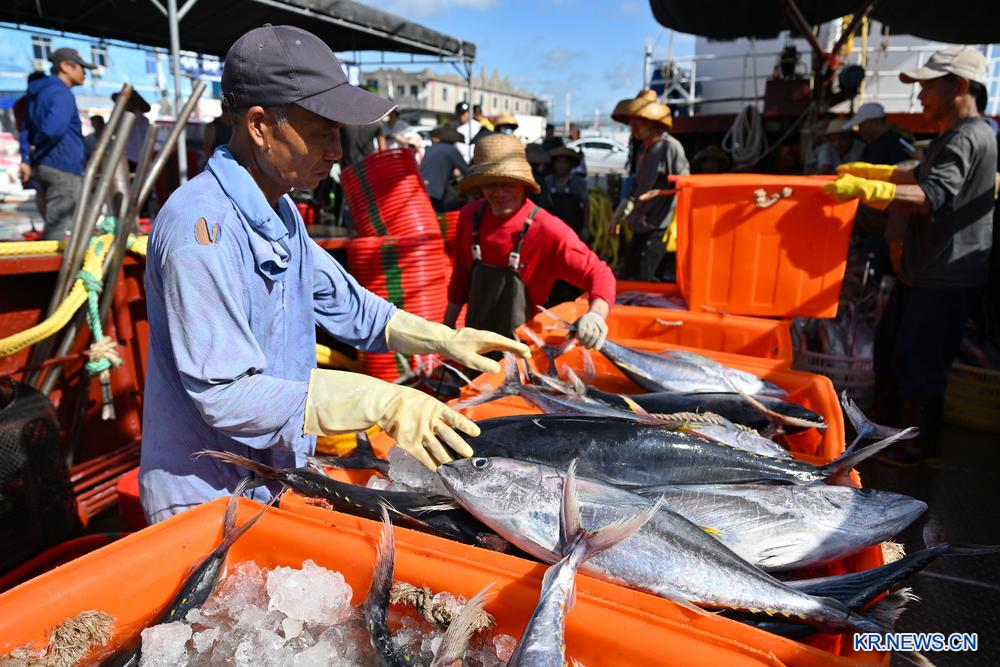 21일 하이난(海南)성 원창(文昌)시 칭란(清瀾)항구에서 어획물을 내리는 어민.