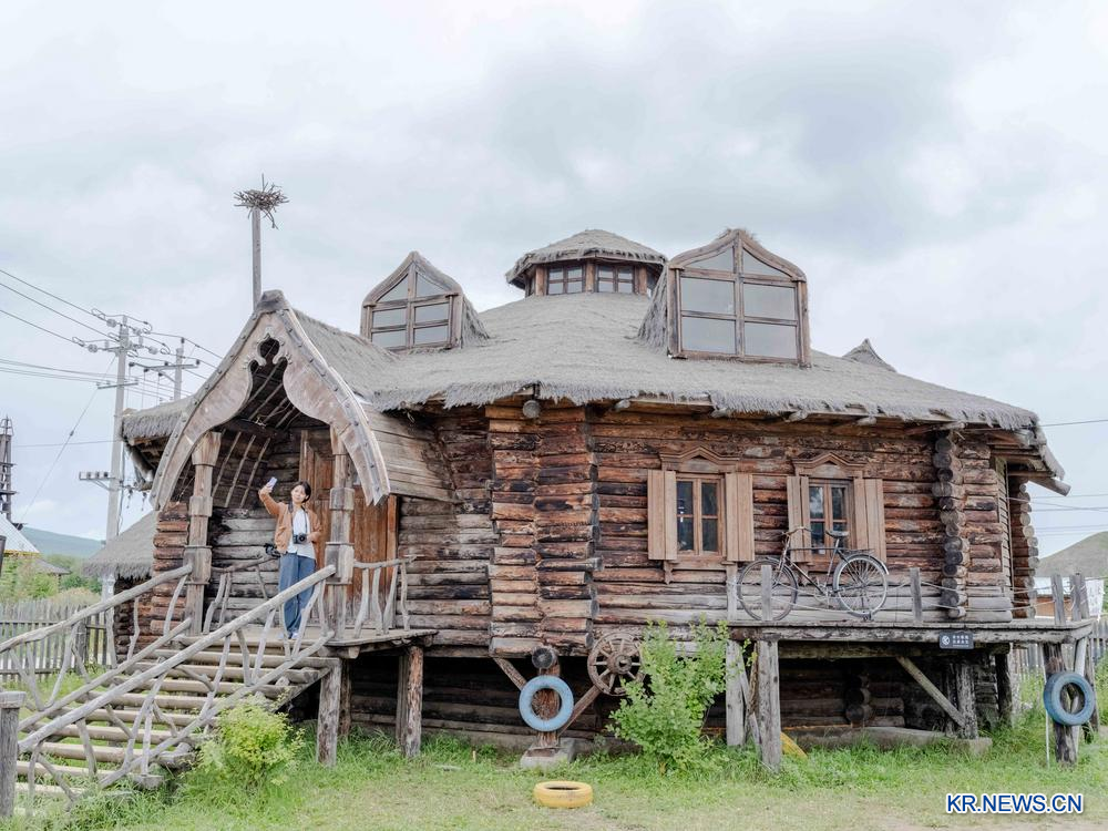 21일 언허러시아민족향에서 여행객들이 현지 전통 목조가옥을 배경으로 기념사진을 찍고 있다. 2025.8.21