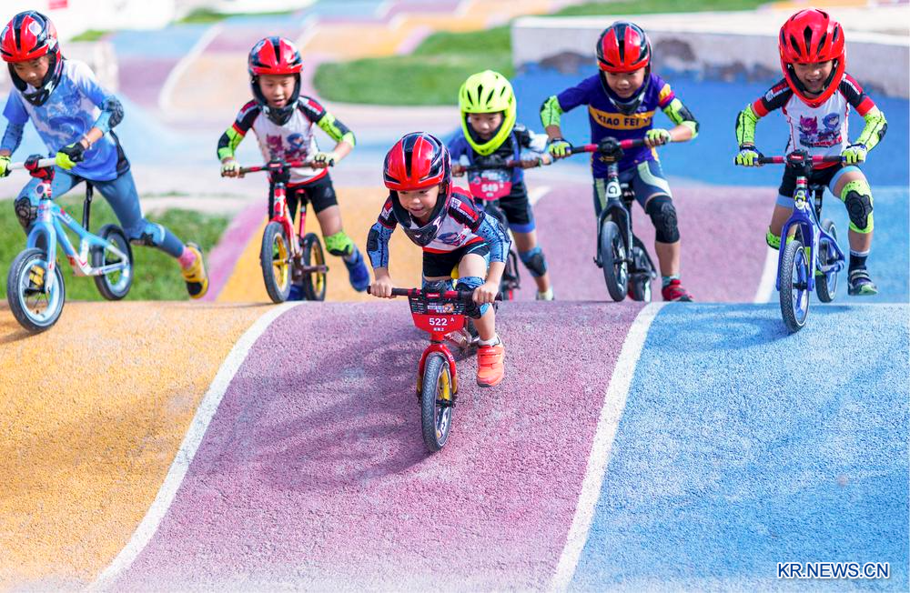 22일 간쑤(甘肅)성 장예(張掖)시의 한 자전거 트랙에서 보호 장비를 착용한 꼬마 라이더들이 언덕을 오르내리고 있다. 2025.8.23