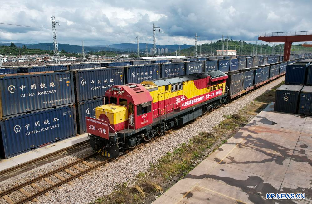 이날 라오스 비엔티안에서 출발해 중국-라오스 철도 위시(玉溪) 옌허(研和)역에 도착한 국제 화물열차를 드론으로 내려다봤다. 2025.8.23