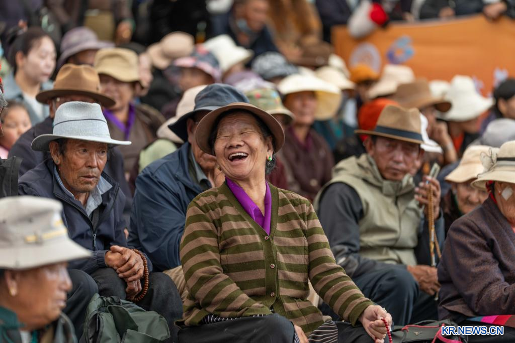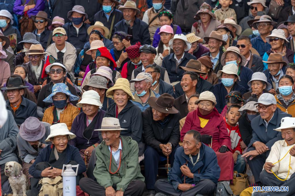 24일 시짱(西藏)자치구 라싸(拉薩) 쭝자오루캉(宗角祿康)공원에서 사람들이 시짱 전통극 공연을 관람하고 있다.