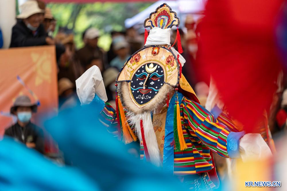 24일 시짱(西藏)자치구 라싸(拉薩) 쭝자오루캉(宗角祿康)공원에서 펼쳐진 시짱 전통극 공연.