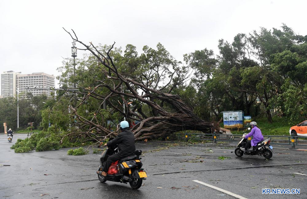 25일 하이난(海南)성 싼야(三亞)시 지양(吉陽)구에서 시민이 전복된 나무를 지나가고 있다.