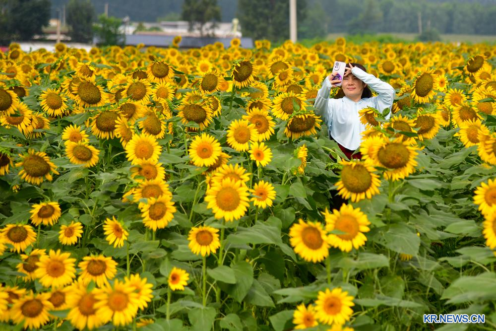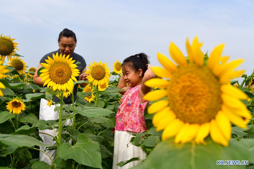 26일 관광객들이 산둥(山東)성 지난(濟南)시 창칭(長清)구 샤오리(孝裡)가도(街道·한국의 동)의 해바라기 밭을 찾아 꽃을 감상하고 있다.