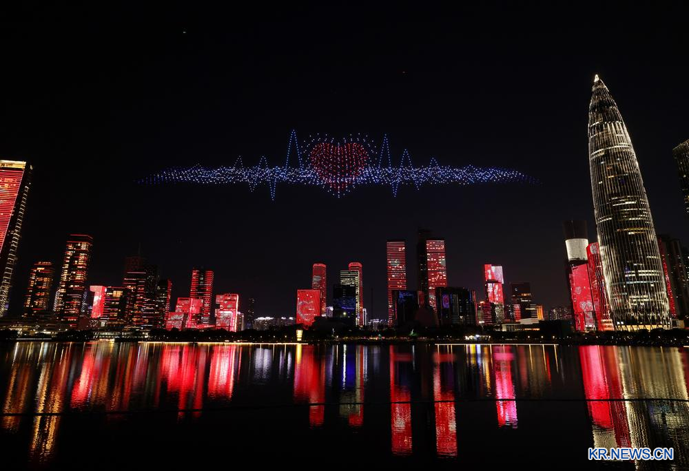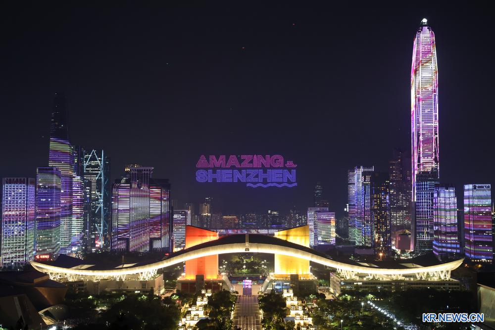 이날 저녁 선전경제특구 설립 45주년을 기념하는 드론 라이트쇼가 선전 시민광장과 인재공원에서 동시에 펼쳐져 과학기술과 예술이 어우러진 빛의 향연으로 시민과 관광객들의 시선을 사로잡았다. 2025.8.26