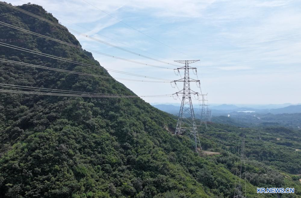 26일 허베이(河北)성 바오딩(保定)시 이(易)현에 위치한 펌핑스토리지 발전소 하부저수지 인근의 발전소 송출 선로를 드론에 담았다.