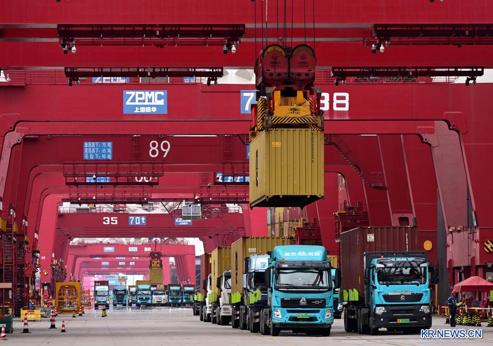 26일 컨테이너 하역 작업으로 분주한 칭다오(青島)항 첸완(前灣)항구 부두.