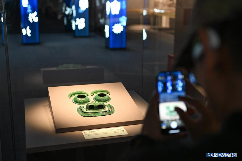 28일 베이징 수도박물관을 찾은 관람객이 얼굴 모양의 청동 장식물을 휴대전화 사진으로 담고 있다.