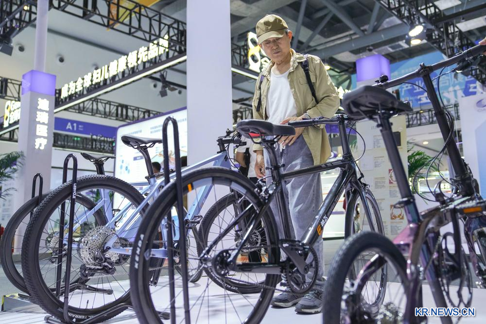 28일 '제15회 중국-동북아 박람회' 지린(吉林)성 현대화 산업 전시구역에서 탄소섬유 자전거를 살펴보는 관람객.