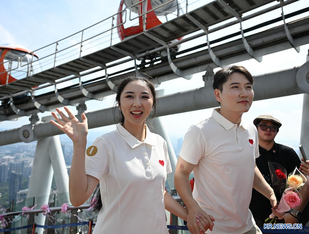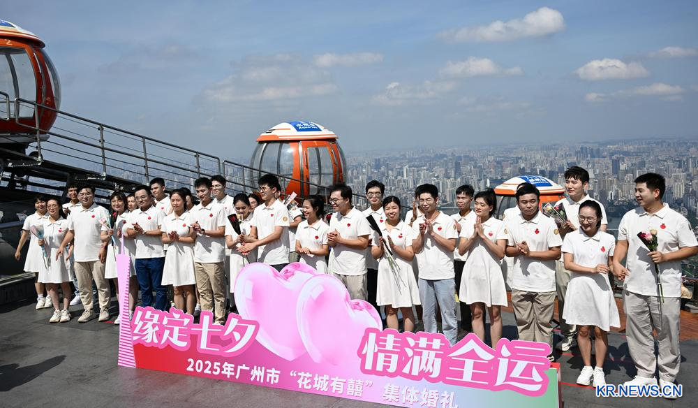 [신화망 광저우 8월30일] '2025년 '화청유희(花城有囍)' 단체 결혼식이 29일 광저우타워 450m 야외 전망대에서 열렸다. 행사에서 15쌍의 신랑신부가 결혼 서약을 나눴다.