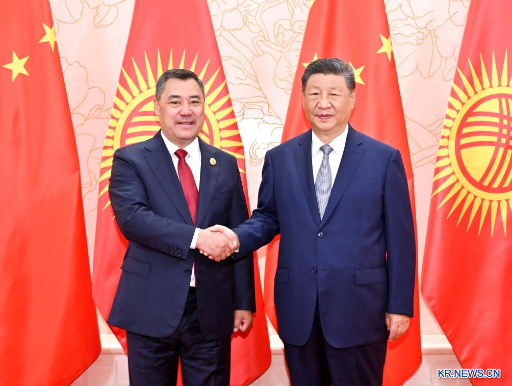 [신화망 톈진 8월31일] 시진핑(習近平) 중국 국가주석이 31일 오전 톈진(天津) 영빈관에서 'SCO 정상회의' 및 '중국인민항일전쟁 및 세계반파시스트전쟁 승리 80주년' 기념행사 참석을 위해 중국을 방문한 사디르 자파로프 키르기스스탄 대통령과 회견했다.[촬영/신화사 기자 웨웨웨이(岳月偉)]pagebreak
