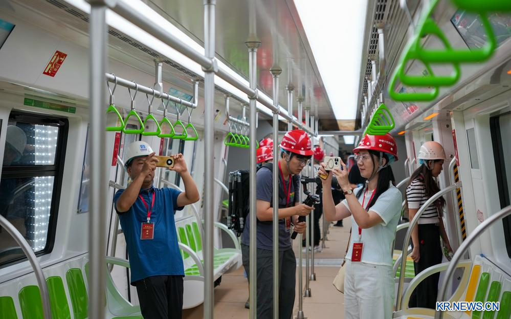 31일 지난(濟南) 지하철 4호선 탕예(唐冶) 남역에서 시민 대표와 기자들이 지하철 열차 내부를 참관하고 있다.