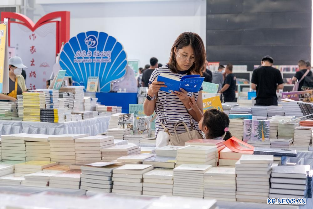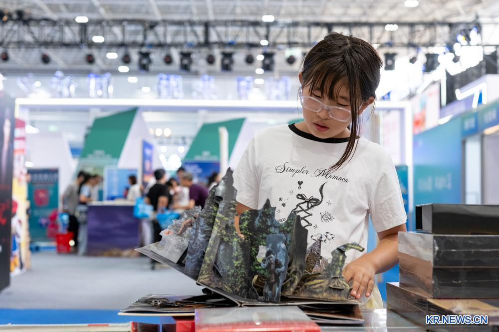8월 31일 '2025 베이장(北疆) 도서전'에서 방문객이 팝업북을 읽고 있다.