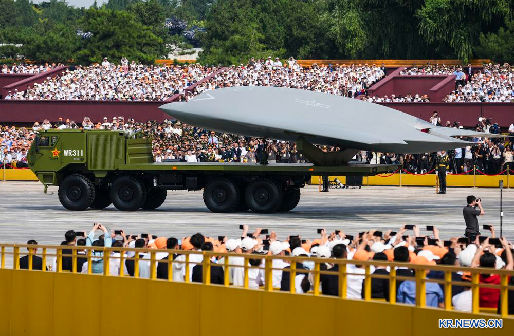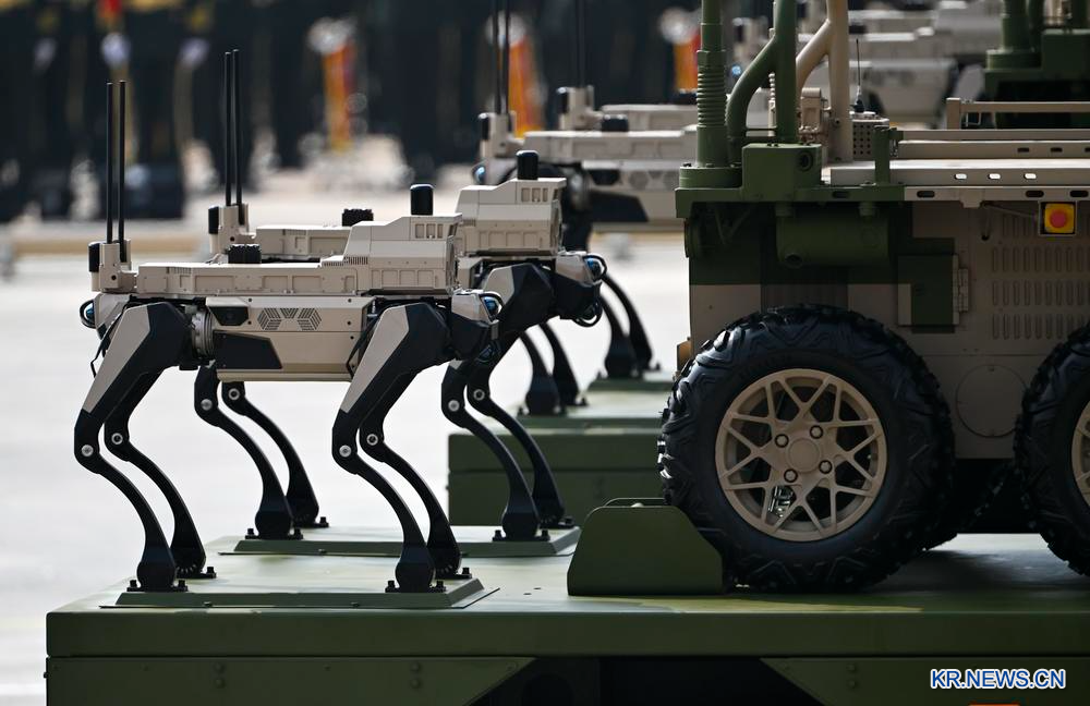 [신화망 베이징 9월3일] 3일 검열을 받고 있는 육상 무인 작전 방진. 이날 '중국인민항일전쟁 및 세계반파시스트전쟁 승리 80주년' 기념대회가 베이징에서 성대하게 열렸다. 2025.9.3
