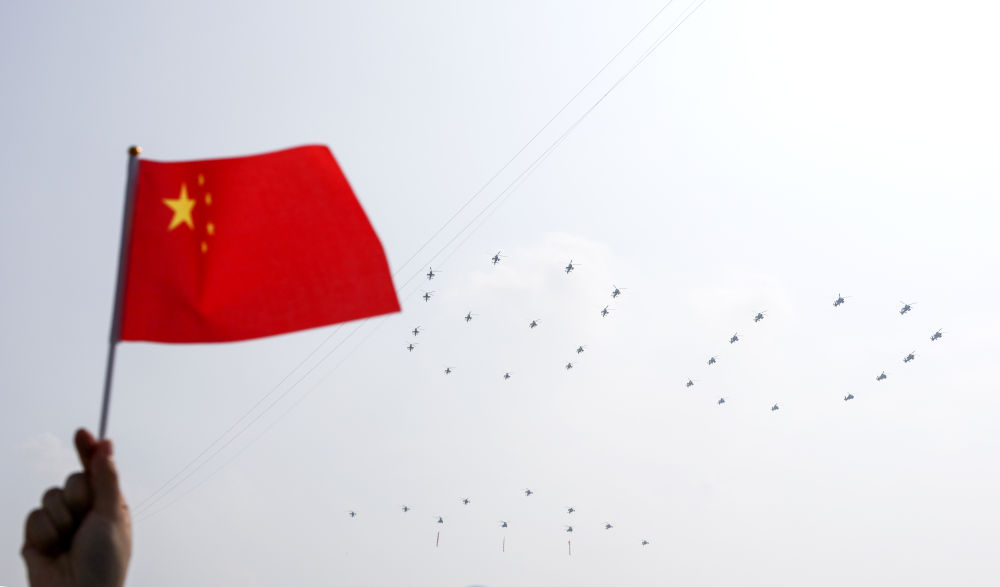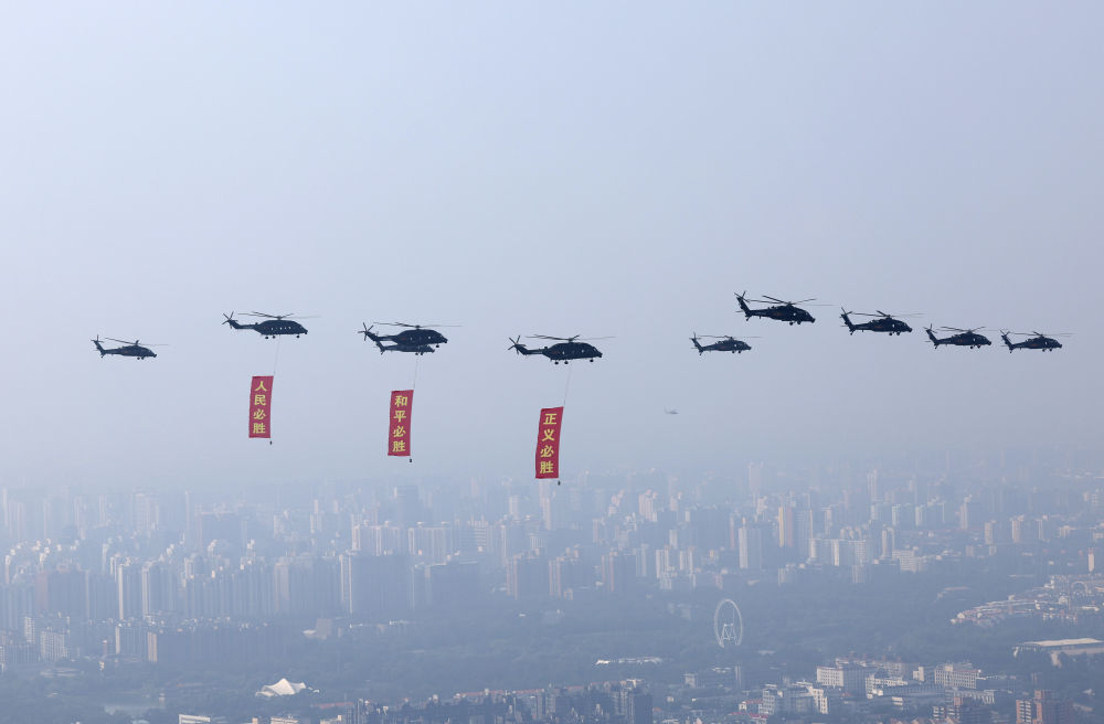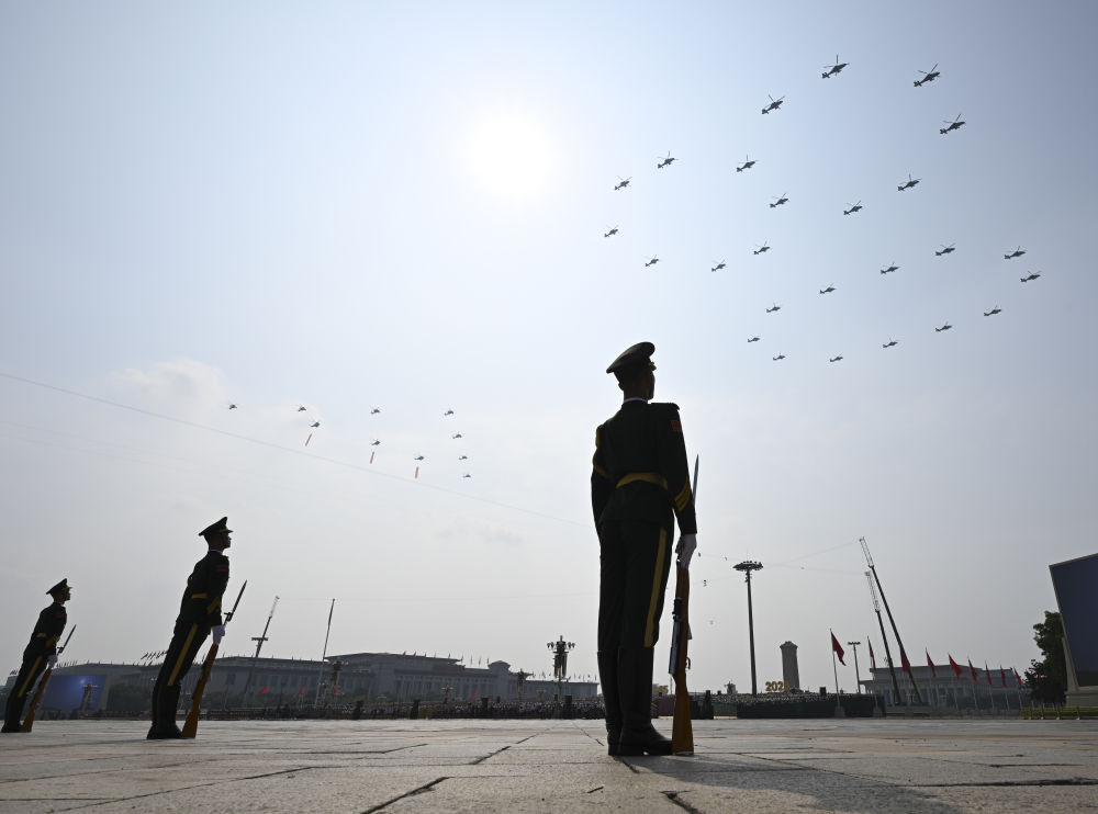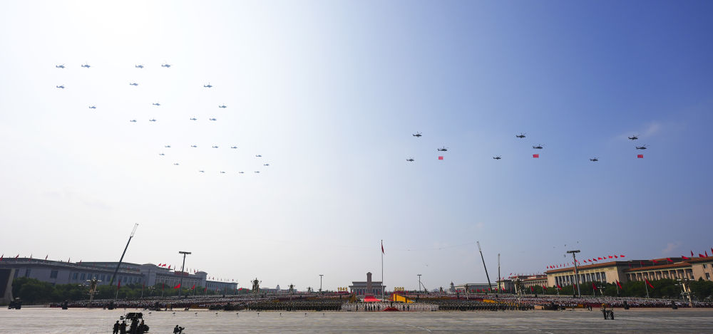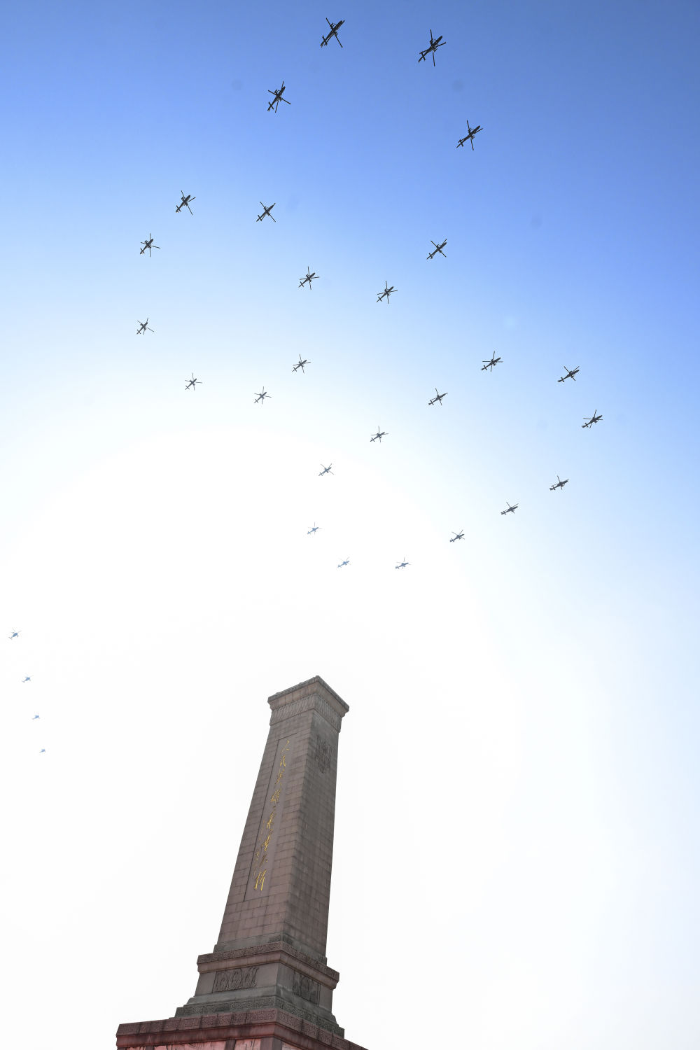 [신화망 베이징 9월3일]중국인민항일전쟁 및 세계반파시스트전쟁 승리 80주년 기념대회가 3일 베이징 톈안먼(天安門) 광장에서 개최됐다.사진은 기수 편대가 베이징 상공을 날아가고 있는 장면