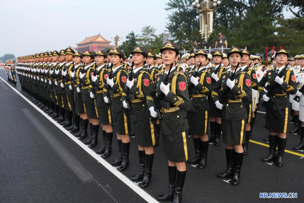 '중국인민항일전쟁 및 세계반파시스트전쟁 승리 80주년' 기념대회가 3일 베이징에서 성황리에 열린다. 사진은 기념대회 시작 전에 사열 받는 부대가 준비하고 있는 모습.