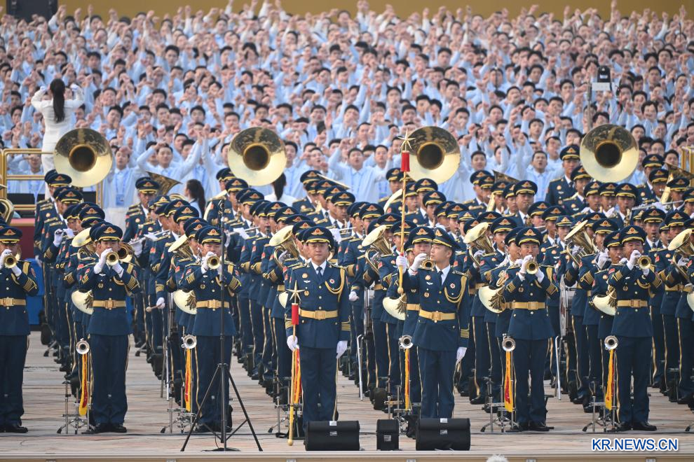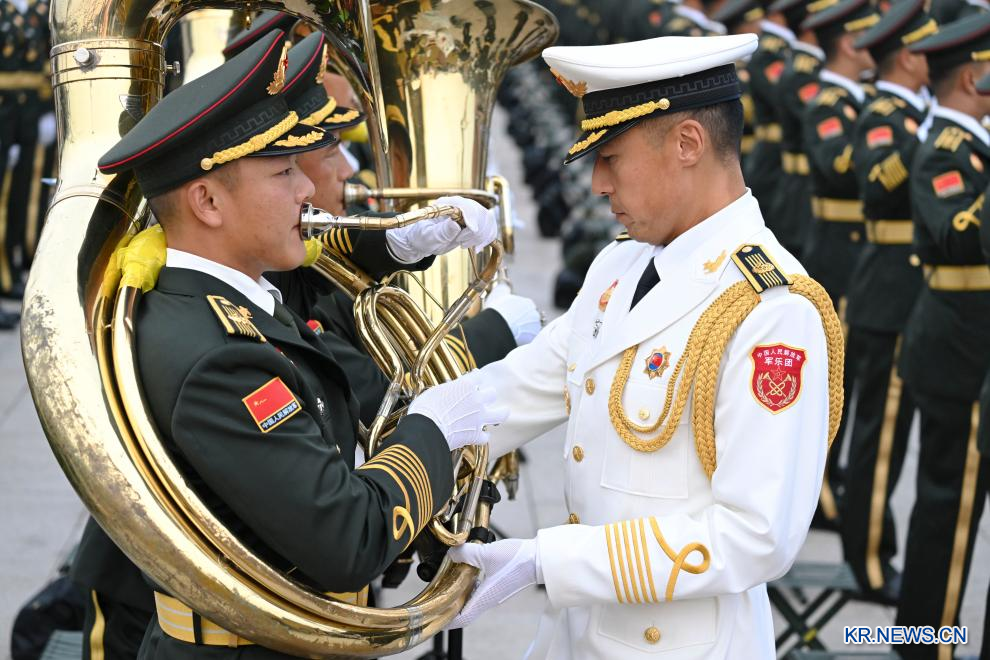 '중국인민항일전쟁 및 세계반파시스트전쟁 승리 80주년' 기념대회가 3일 베이징에서 성황리에 열린다. 사진은 기념대회 시작 전에 중국인민해방군 연합 군악대가 리허설을 하고 있는 모습.pagebreak
