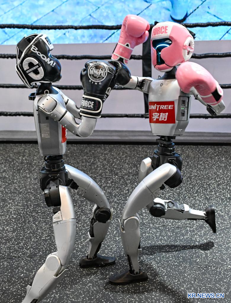 '2025 세계 스마트 산업 박람회'를 찾은 취재진과 관람객이 4일 위수(宇樹)테크(Unitree Robotics) 전시장에서 로봇 복싱 경기를 관람하고 있다.