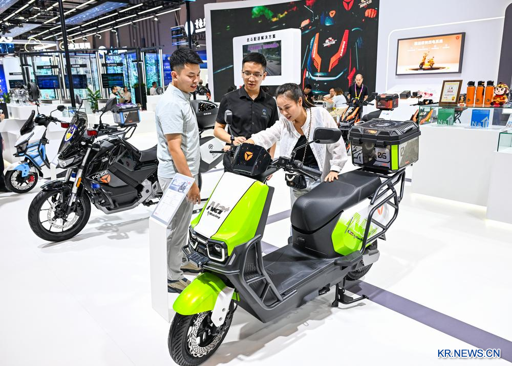 5일 관람객들이 '2025 세계스마트산업박람회' 현장에서 전동 오토바이를 살펴보고 있다.