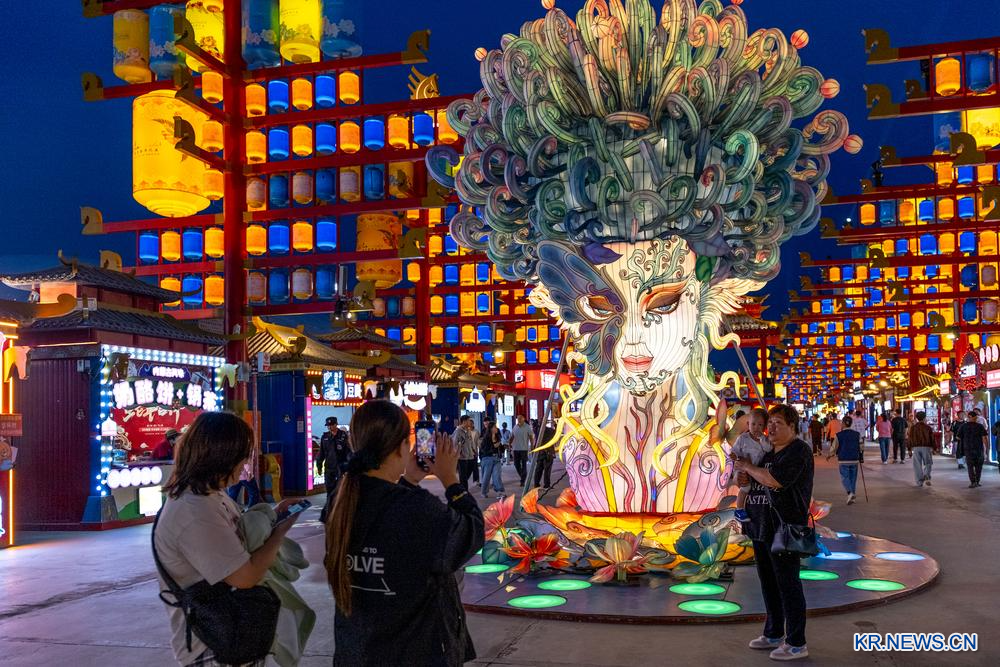 관광객들이 4일 네이멍구(內蒙古)자치구 우란차부(烏蘭察布)시 '우란차부의 밤' 테마거리에 마련된 꽃등 앞에서 사진을 찍고 있다.