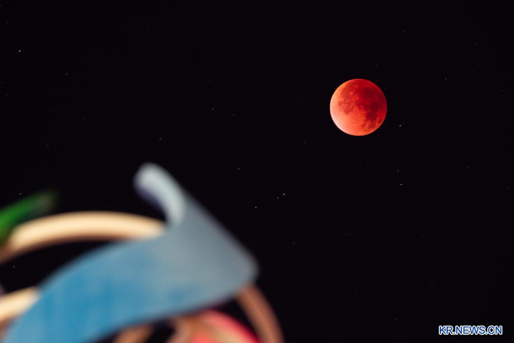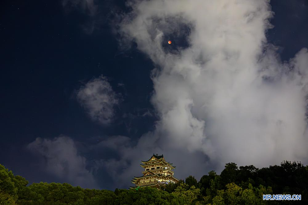 8일 새벽 윈난(雲南)성 멍쯔(蒙自)시에서 촬영한 붉은 달.