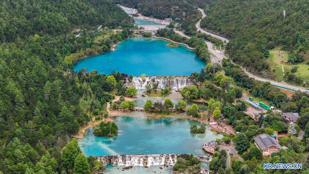 [신화망 리장 9월9일] 란웨구(藍月谷)는 윈난(雲南)성 리장(麗江)시 위룽(玉龍)설산 동녘, 윈산핑(雲杉坪) 남쪽 한 산골 마을에 위치해 있다. 9월의 란웨구 호수는 물이 가득 차 맑고 투명하다. 이는 마치 파란 보석들이 계곡 속에 박혀 있는 듯한 풍경을 자아내 관광객의 발길이 끊이지 않는다.