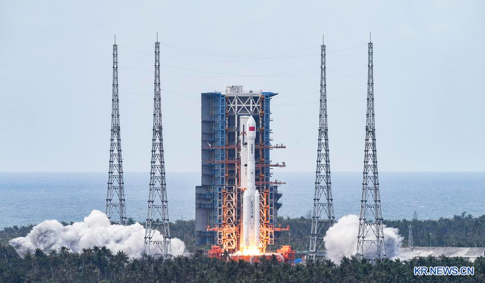 9일 하늘로 날아오르는 창정(長征) 7호 개조 운반로켓.