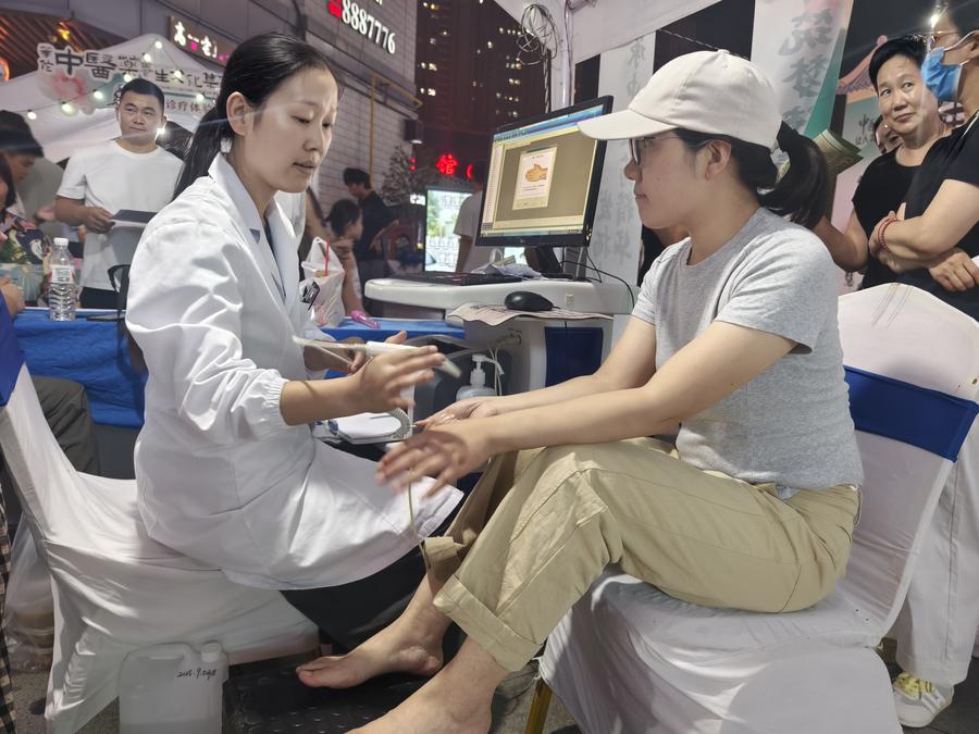 야시장에 마련된 중의 체질 분석기 앞에는 사람들로 장사진을 이룬다. 덩쥔메이(鄧君梅) 보저우시중의의원 의사는 "이 기기는 진맥 시뮬레이션을 통해 손목, 발목 등 여러 혈자리에서 신체 데이터를 수집하고 스마트 소프트웨어 분석을 거쳐 자세한 중의 체질 분석 보고서를 생성한다"며 "시민들에게 과학적이고 실용적인 건강 상태 정보를 제공한다"고 소개했다.