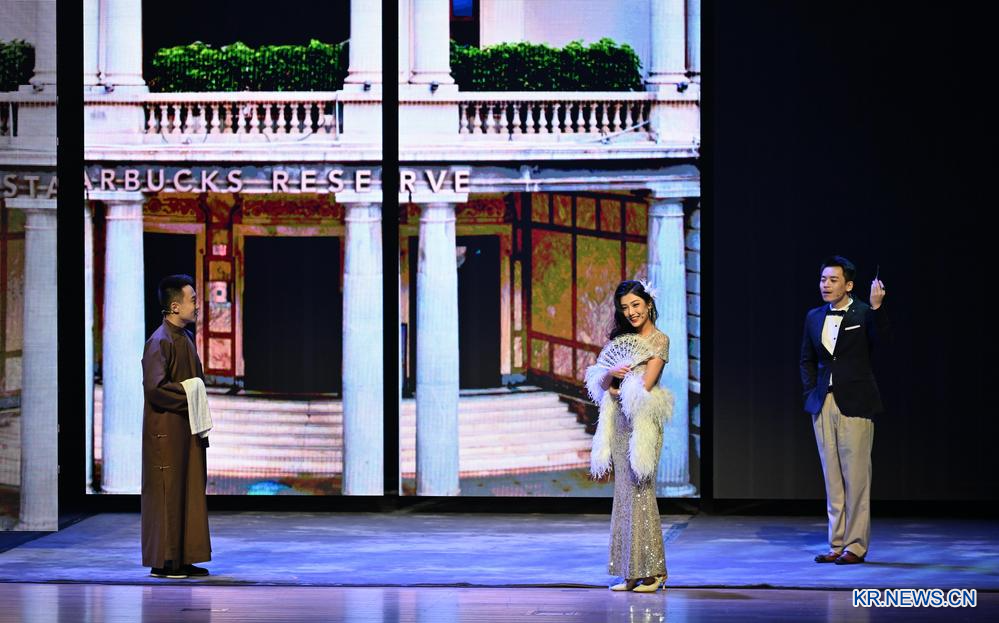 13일 톈진(天津) 대강당에서 열연 중인 연극 배우들.