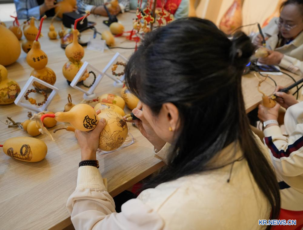 13일 신장(新疆)위구르자치구 타청(塔城)지구 어민(額敏)현 기억관(館)에서 전통문화 애호가가 조롱박 낙화(烙画) 그림을 체험하고 있다.