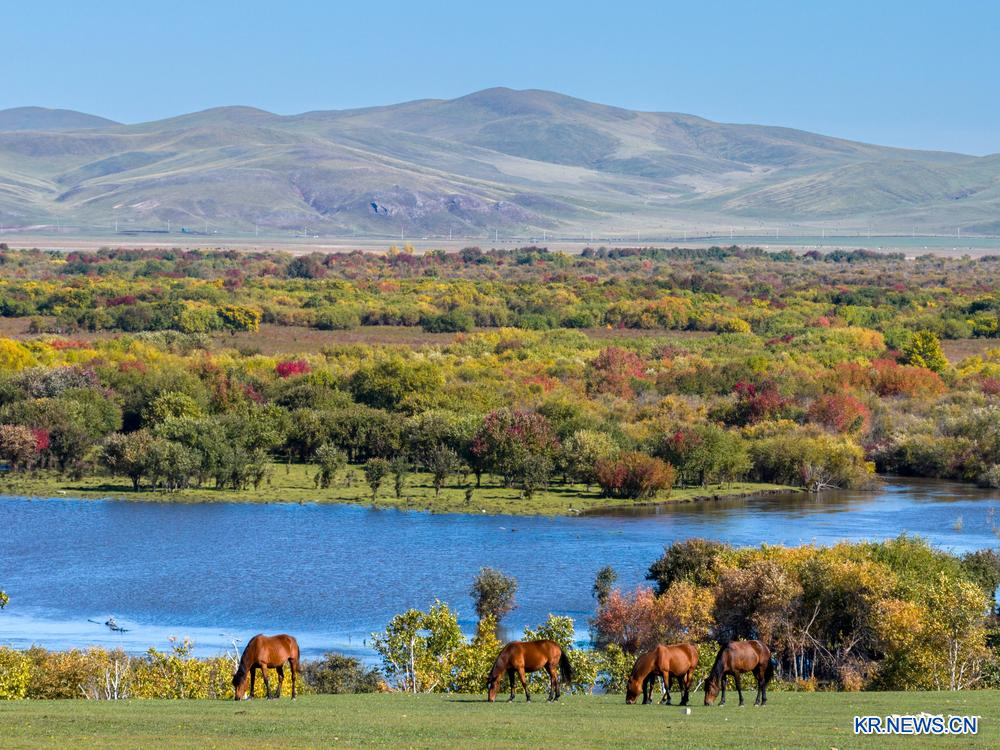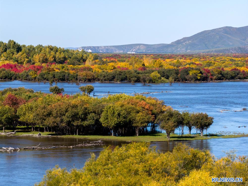[신화망 후룬베이얼 9월17일] 가을옷으로 갈아입은 네이멍구(內蒙古)자치구 어얼구나(額爾古納)습지에 다양한 관목과 굽이치는 강물이 어우러져 알록달록 아름다운 장면을 연출하고 있다.